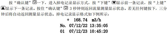 該記錄表示:*一條掉電記錄(No.1),停電時間為 07 年 12 月 22 日 13 點 35 分 05 秒,重新上電時間為 07 年 12 月 23 日 10 點 45 分 20 秒,掉電時的瞬時流量為 168.74m3/h,該次掉電時間長度為 21 小時 10 分鐘。